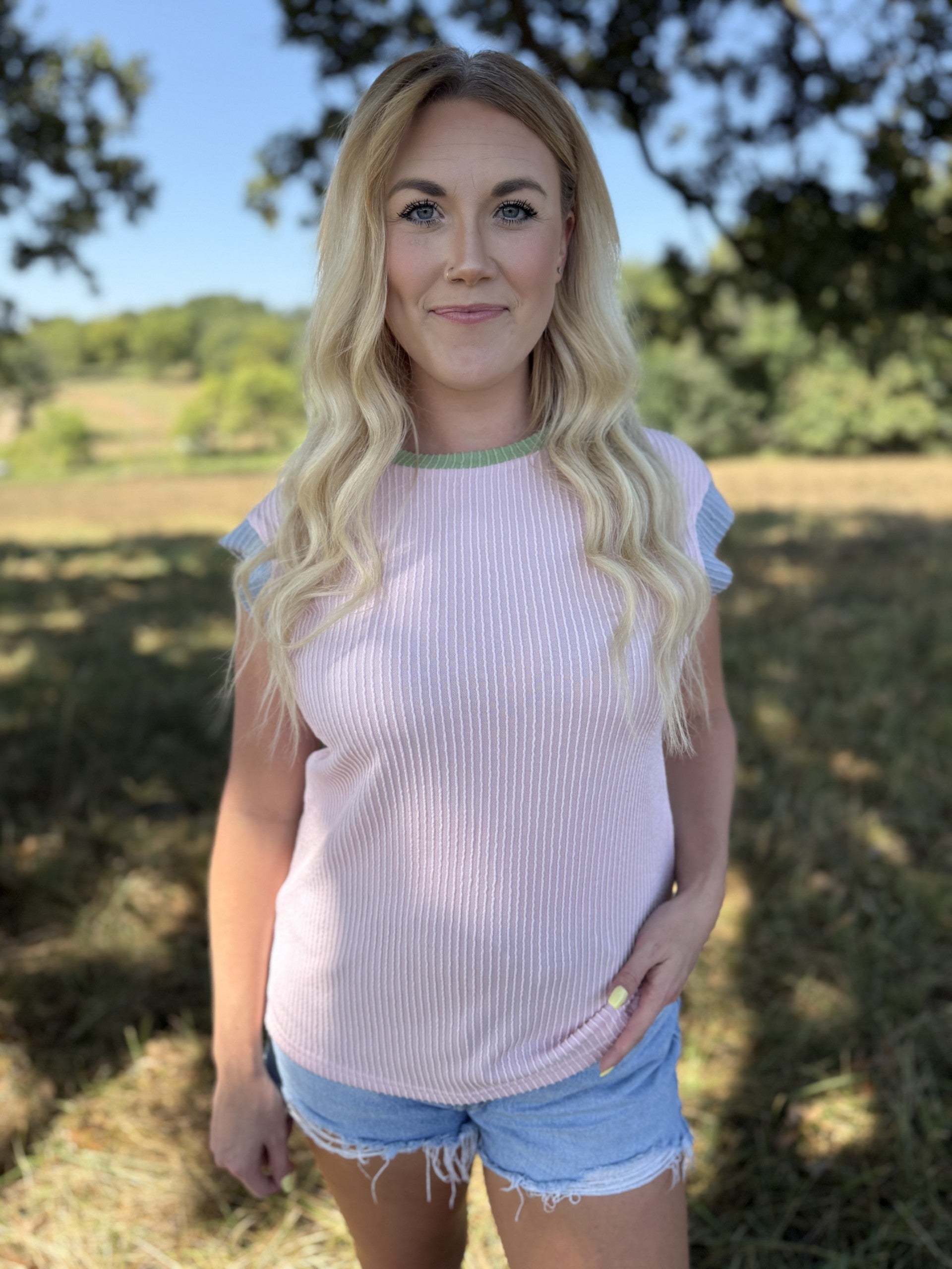 This top is stylish and modern, featuring corded knit fabric and contrast trim that creates a colorblock design!