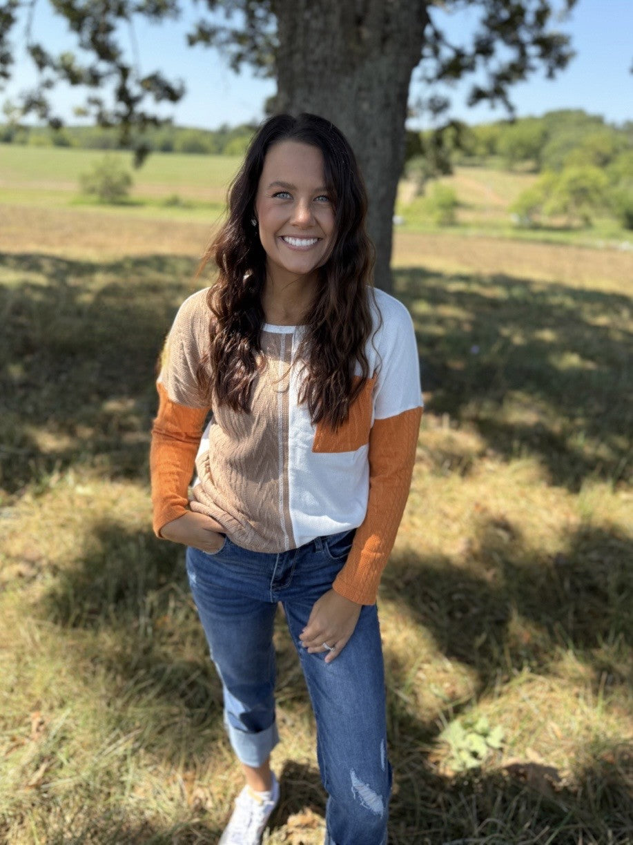 Long Sleeved Colorblock Pocket Textured Knit Top
