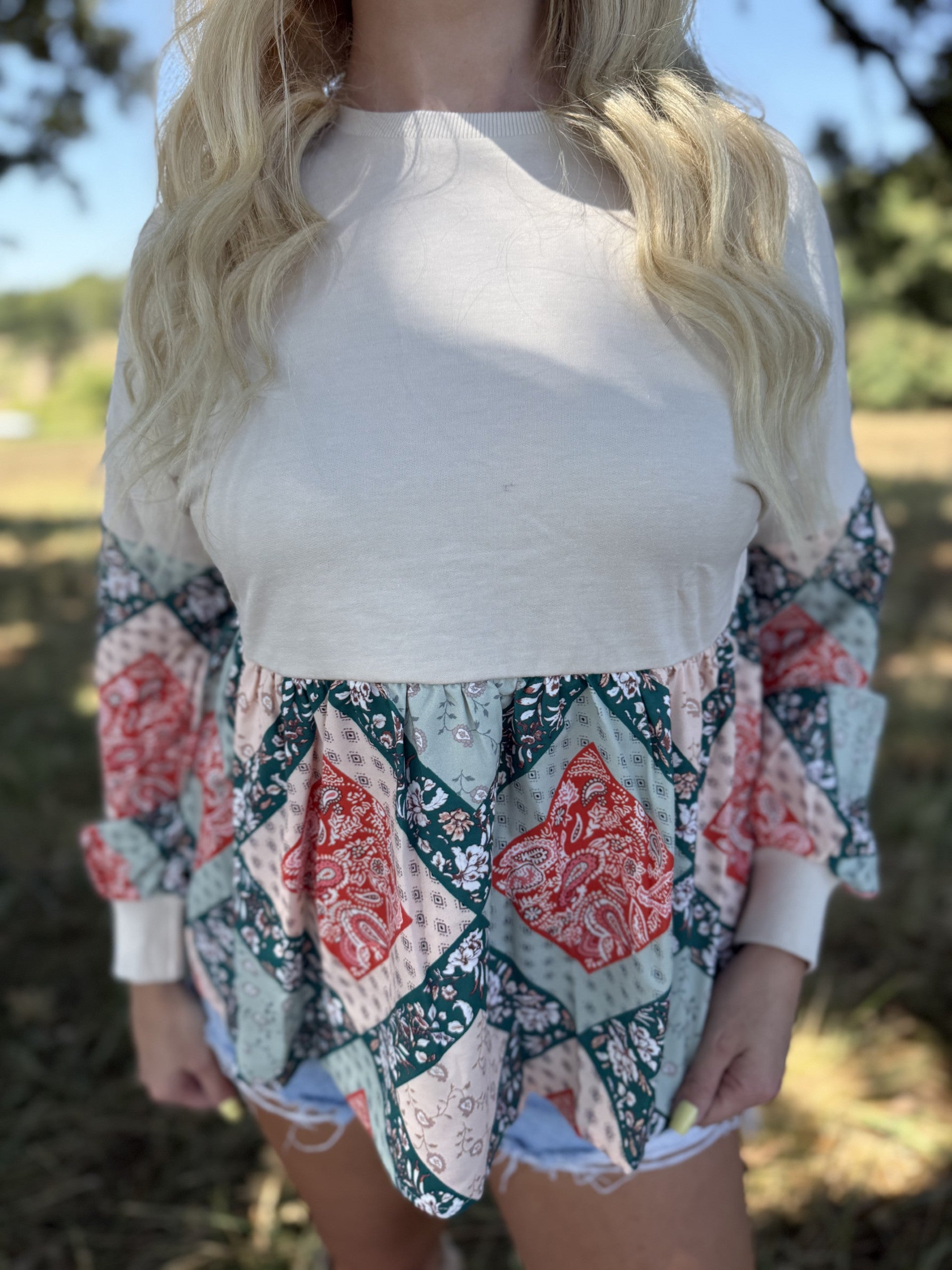 This top features a unique paisley geometric patchwork design! A must-have staple for any fall/winter wardrobe!
